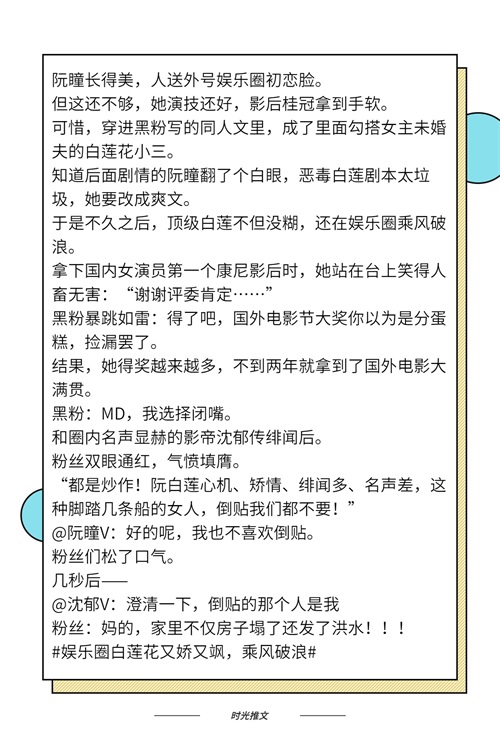 第二本:女主本身演技实力都厉害,结果一不小心穿到黑粉写的同人文中,还是个勾搭同人文女主未婚夫的白莲花小三,既然如此,那就别怪她“开大”!