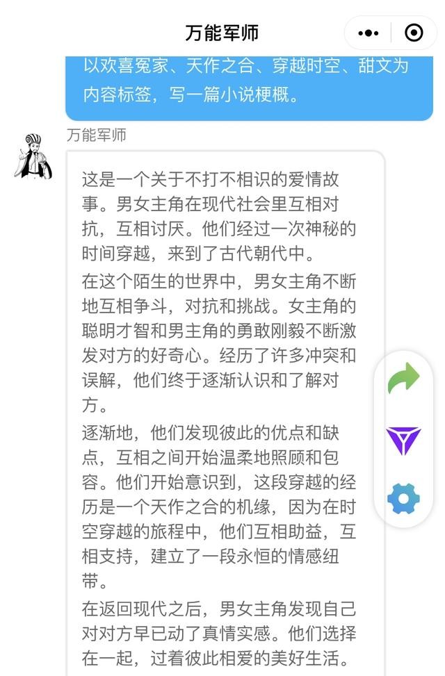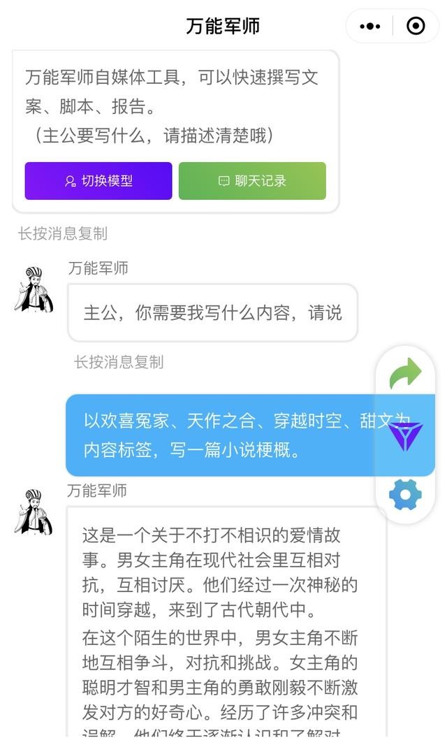 另外给新人或学生党的一点小建议:刚开始写小说难免会遇到没灵感或者卡文的情况,大家可以通过万能军师小程序获取创意思路哦,它也可以帮咱们代写的!
