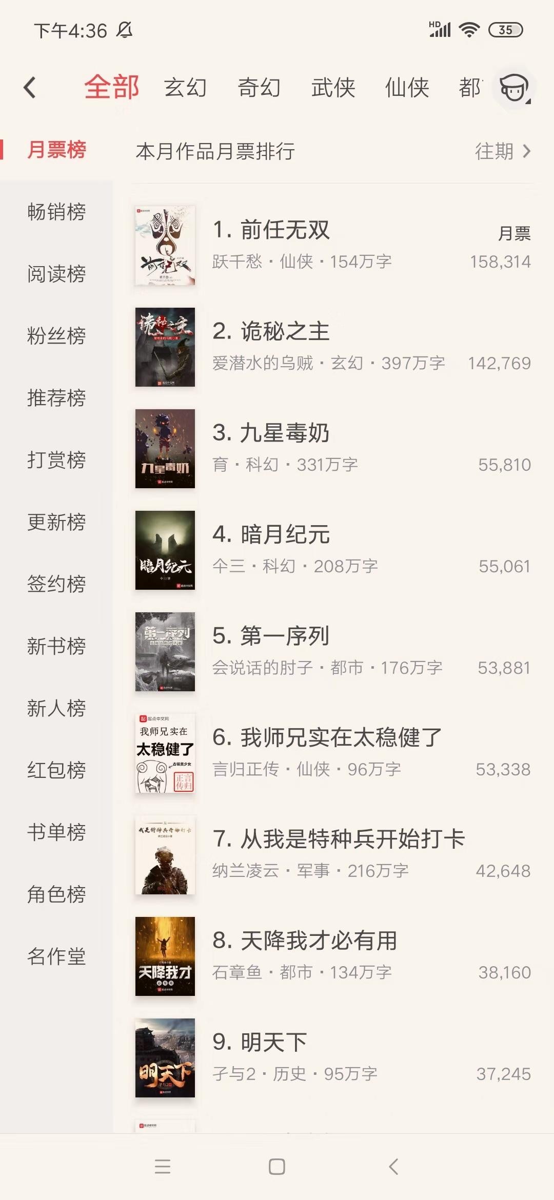 排行榜的第5名为《一剑斩破九重天》第六名为《问道红尘》第7名为《大数据修仙》第8名为《剑徒之路》第9名为《天下第九》第10名为《仙秦多元宇宙帝国》排行榜的前10名除了第二名我师兄太稳健了以外,其他均已经超过了百万字了,大家想要看的话可以去看哦。