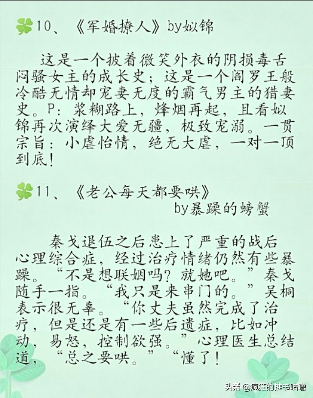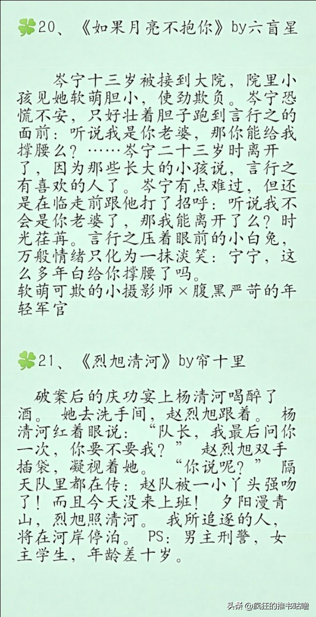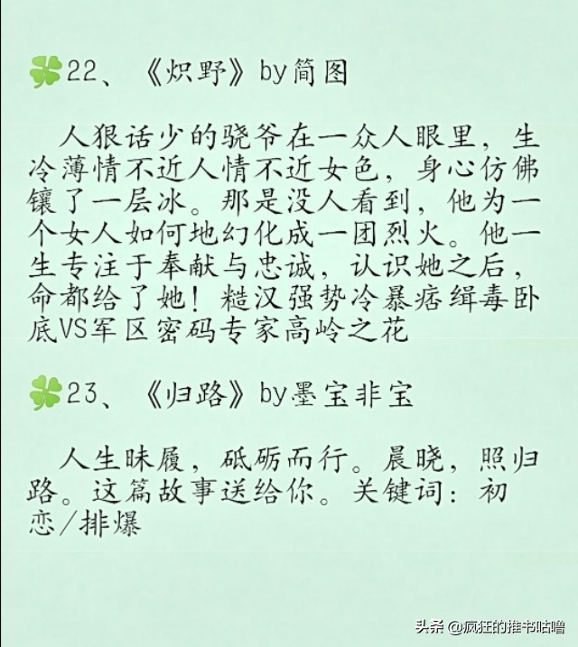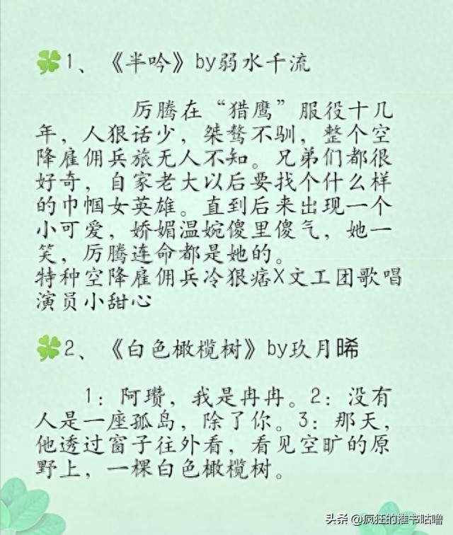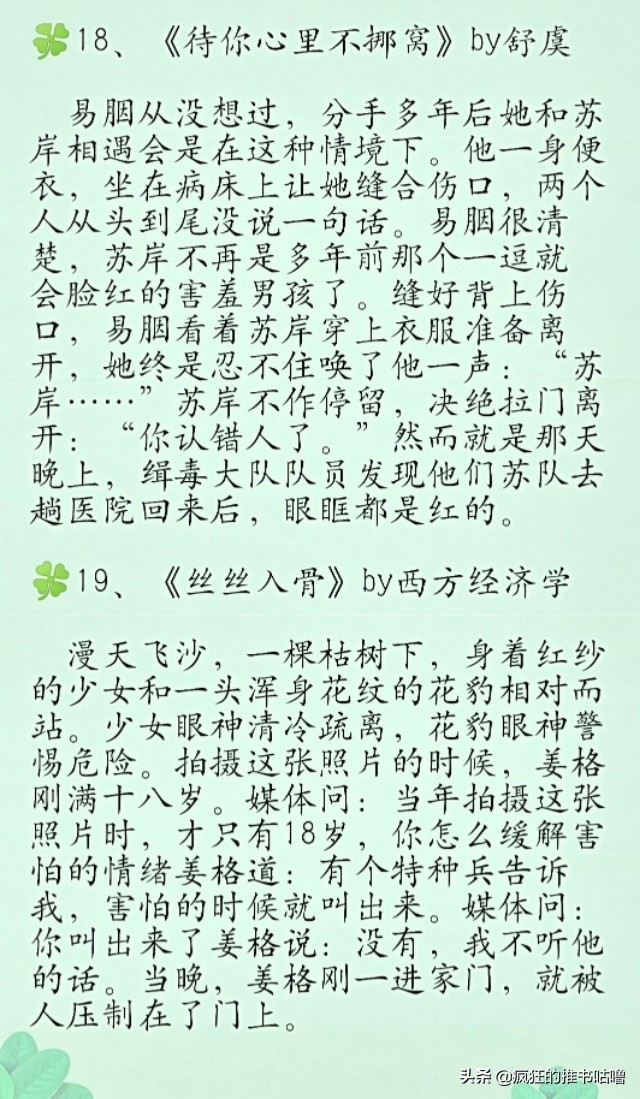 强烈推荐《丝丝入骨》、《白色橄榄树》、《他与爱同罪》、《半生熟》,真的太爱了,没推荐不代表不好看哦,25本都是咕噜精选的,喜欢的话先收藏起来慢慢看哦(。>ㅿ<。)