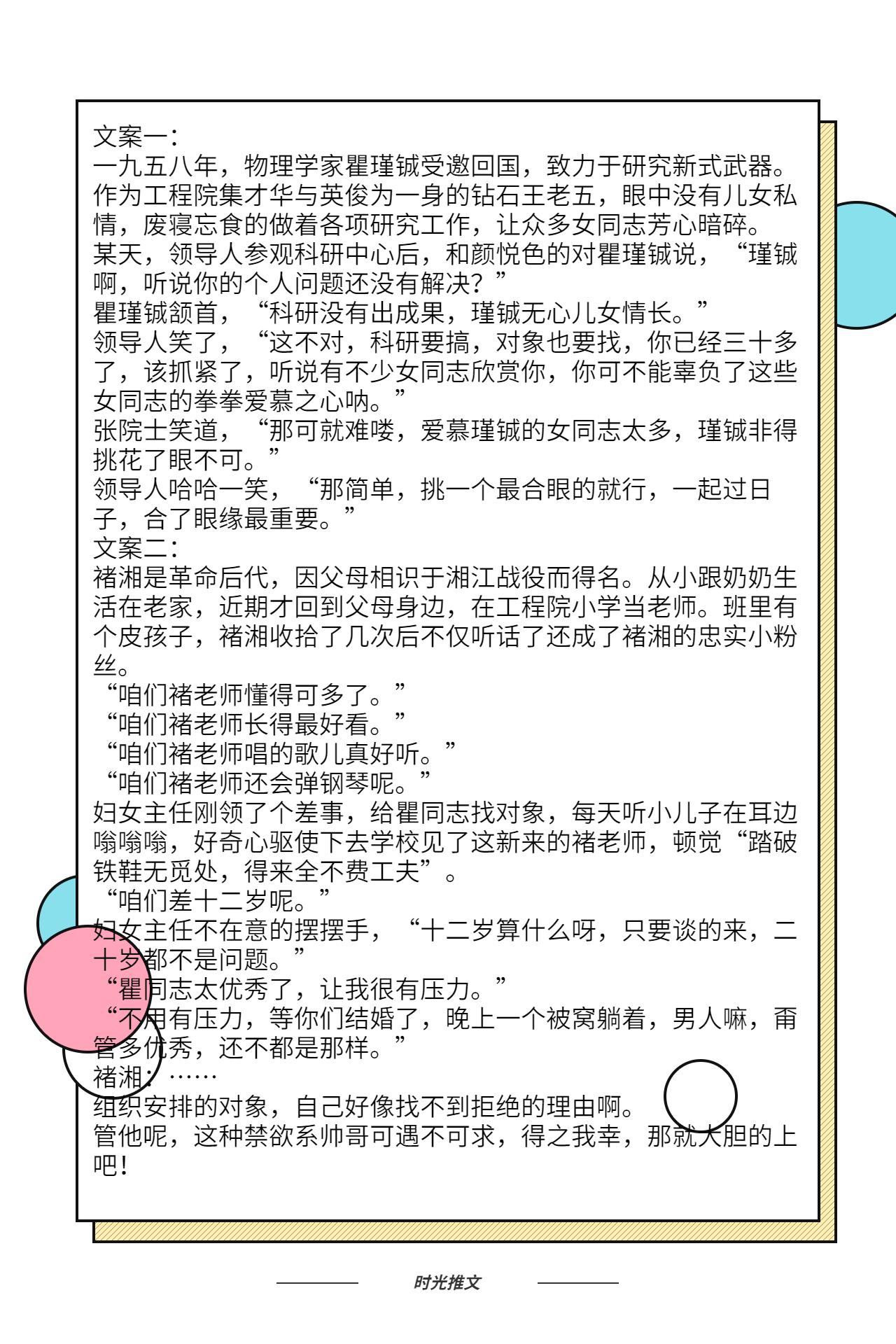 这个作者写过不少的年代文,这本苏爽强国文,女主暴躁女战士VS龟毛科研男博士,男女主皆是从末世穿到六零年代。