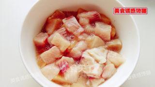 2鱼丁里放入盐、胡椒粉、蛋清拌匀,腌制入味。