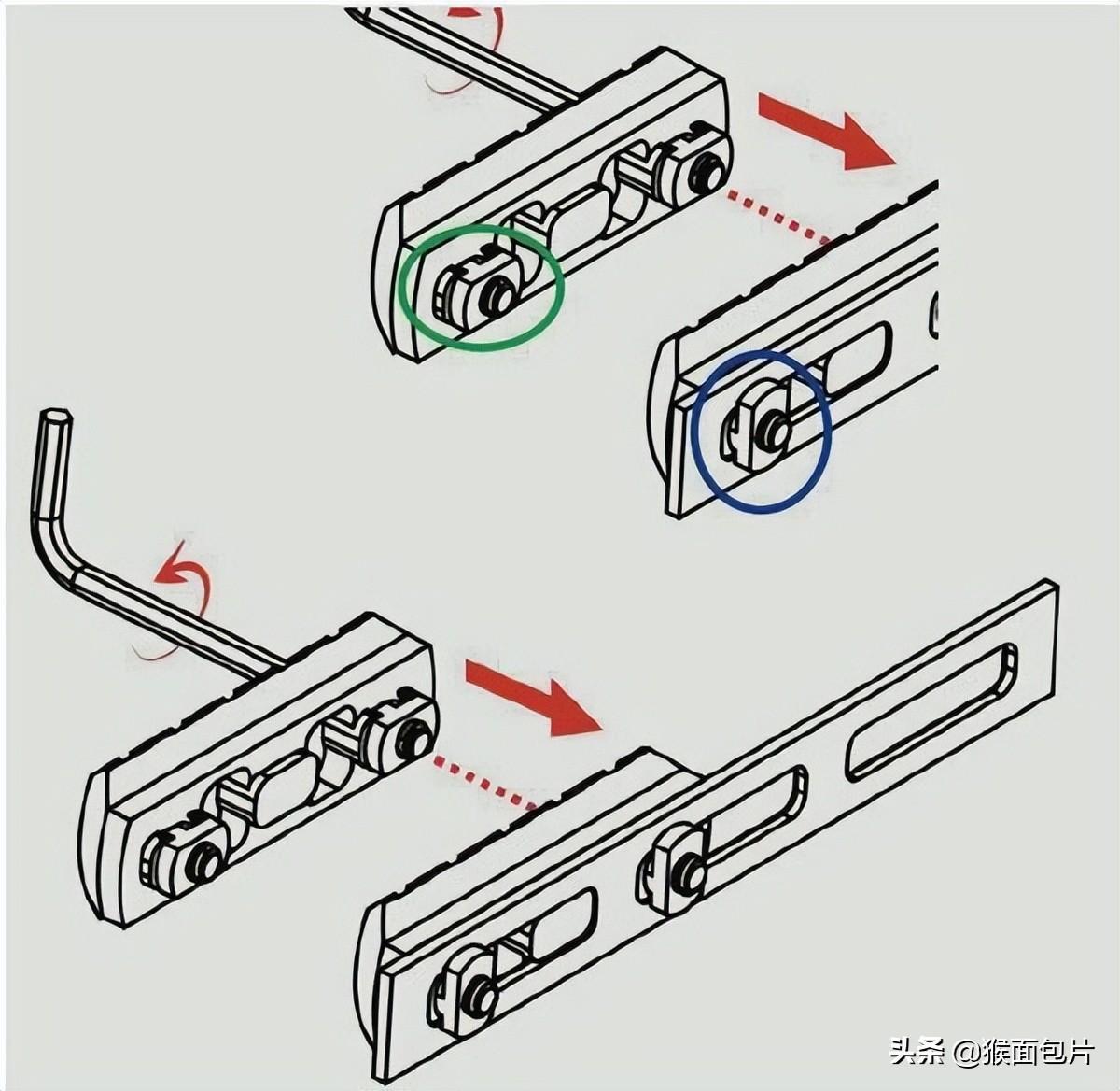 绿圈中是未安装至护手上的M-Lok附件上的螺母,近似长方形,边缘呈弧形,其为纵向状态。蓝圈中是安装至护手的M-Lok插槽后的长方形螺母,拧动螺丝后,长方形螺母就转向90°变成横向状态。
