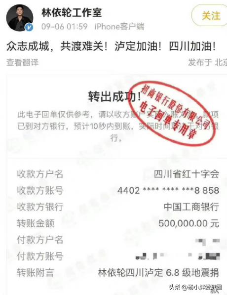 在9月6日凌晨时分,知名艺人林依轮向四川省红十字会捐款50万元人民币支援灾区,他是娱乐圈中第一位捐款的明星,尽绵薄之力送出了自己的一份爱心,希望大家能够众志成城、共渡难关!