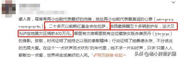 一向热衷于公益事业的韩红,也在第一时间捐款献爱心,其中泸定县捐200万,雅安市捐200万,一共捐出400万。之后韩红基金会仍在持续关注灾情,愿尽全力协助灾区救援。