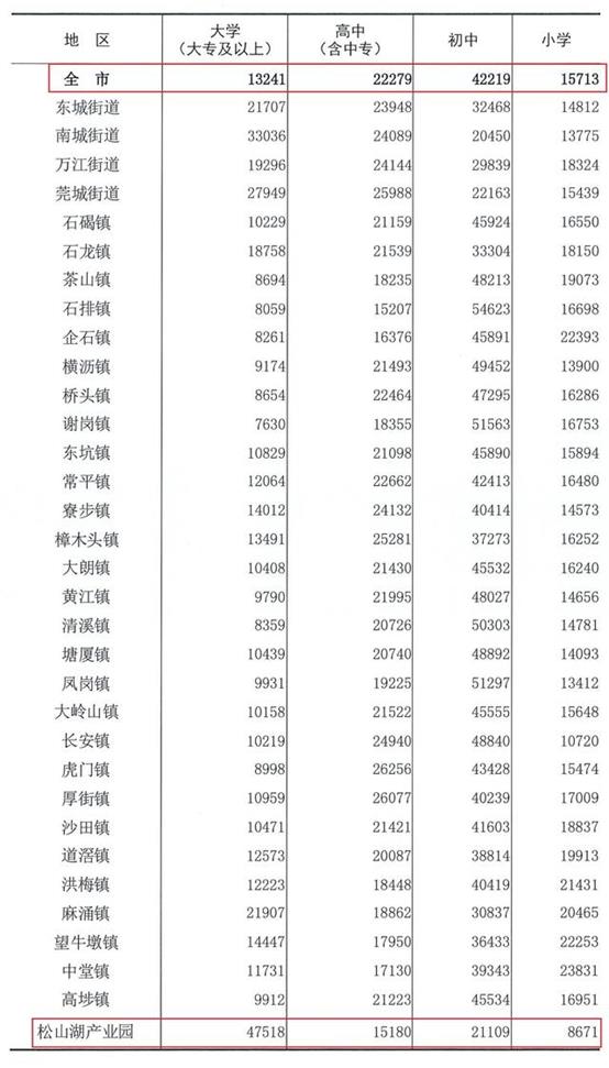 第一名,松山湖每10万人中,便有47518人拥有大学文化程度,约占常住人口的一半,远超全市平均水平。