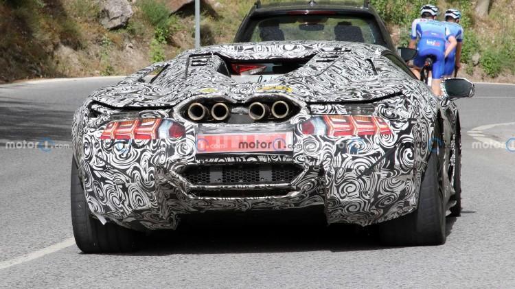 来到尾部,该车将排气改成了霸道的中置四出布局,位置也非常进一步升高,排气两侧等带有明显的空气导流设计,暂时不清楚是否是可升降的。至于尾灯,测试车的尾灯疑似使用现款Aventador的尾灯贴纸进行伪装,没啥参考价值。