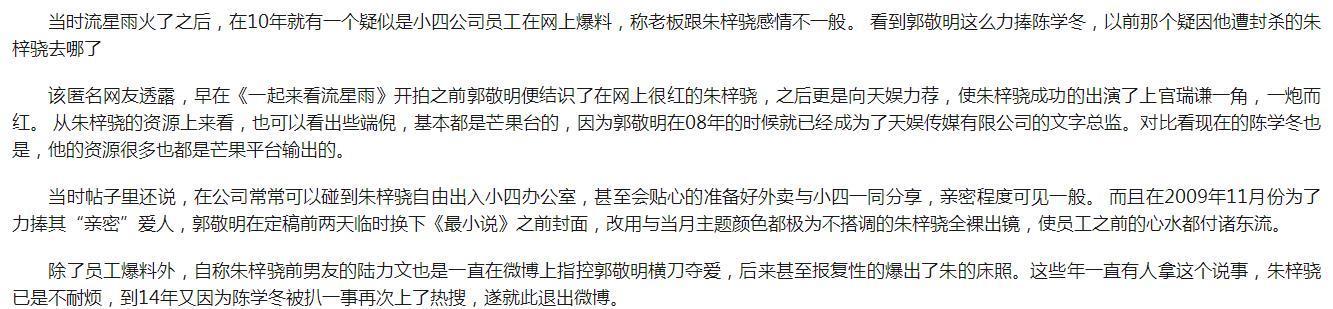 最近朱梓骁和郭敬明之前的事又被扒出来,深受其扰的朱梓骁扒的彻底清空了微博,从此和郭敬明形同陌路。