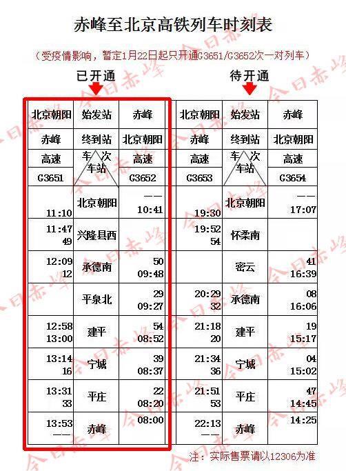 铁路部门目前列出的客运时刻表,赤峰至北京计划运行两对高速列车。受疫情影响,暂定1月22日起只开行G3651/G3652次一对,G3653/G3654次何时开通另行通知。实际售票请以12306为准。