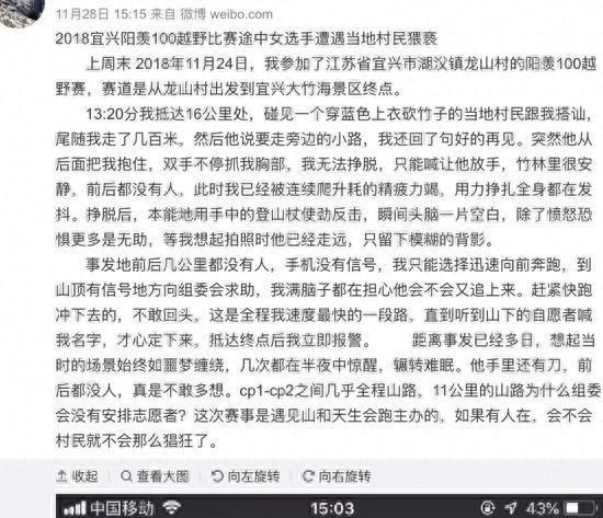 11月28日,一名女赛车手在微博爆料,自己正在参加11月24日的宜兴阳羡100超级越野赛。经过不断的反抗和呼救,他们才摆脱了纠缠。更可怕的是,当时村民身边还放着一把竹砍刀。