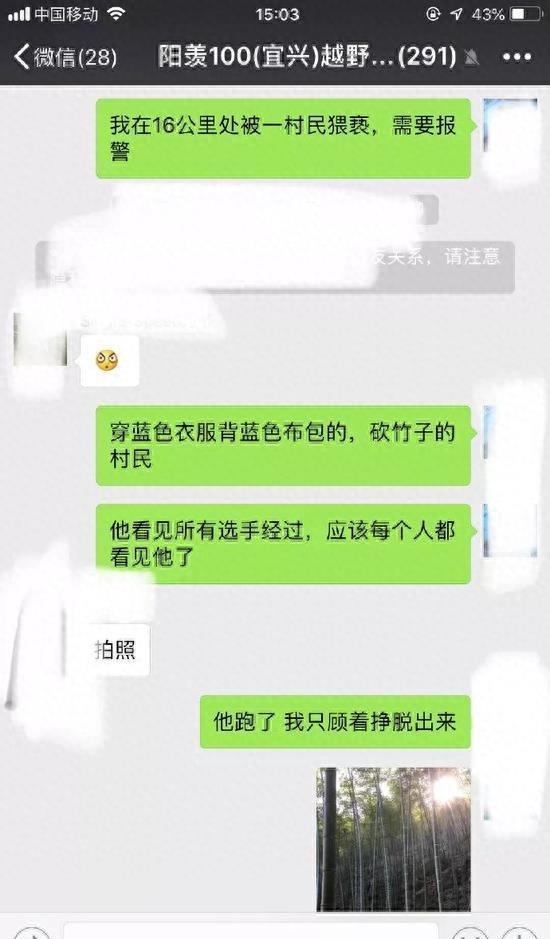 事发前后几公里内都没有人,她的手机也没有信号。她只能选择快速向前跑,不敢回头,跑到山顶有信号向组委会求救的地方,直到听到山下志愿者在喊她的名字。。。冷静下来后,她才选择在到达终点后立即报警。