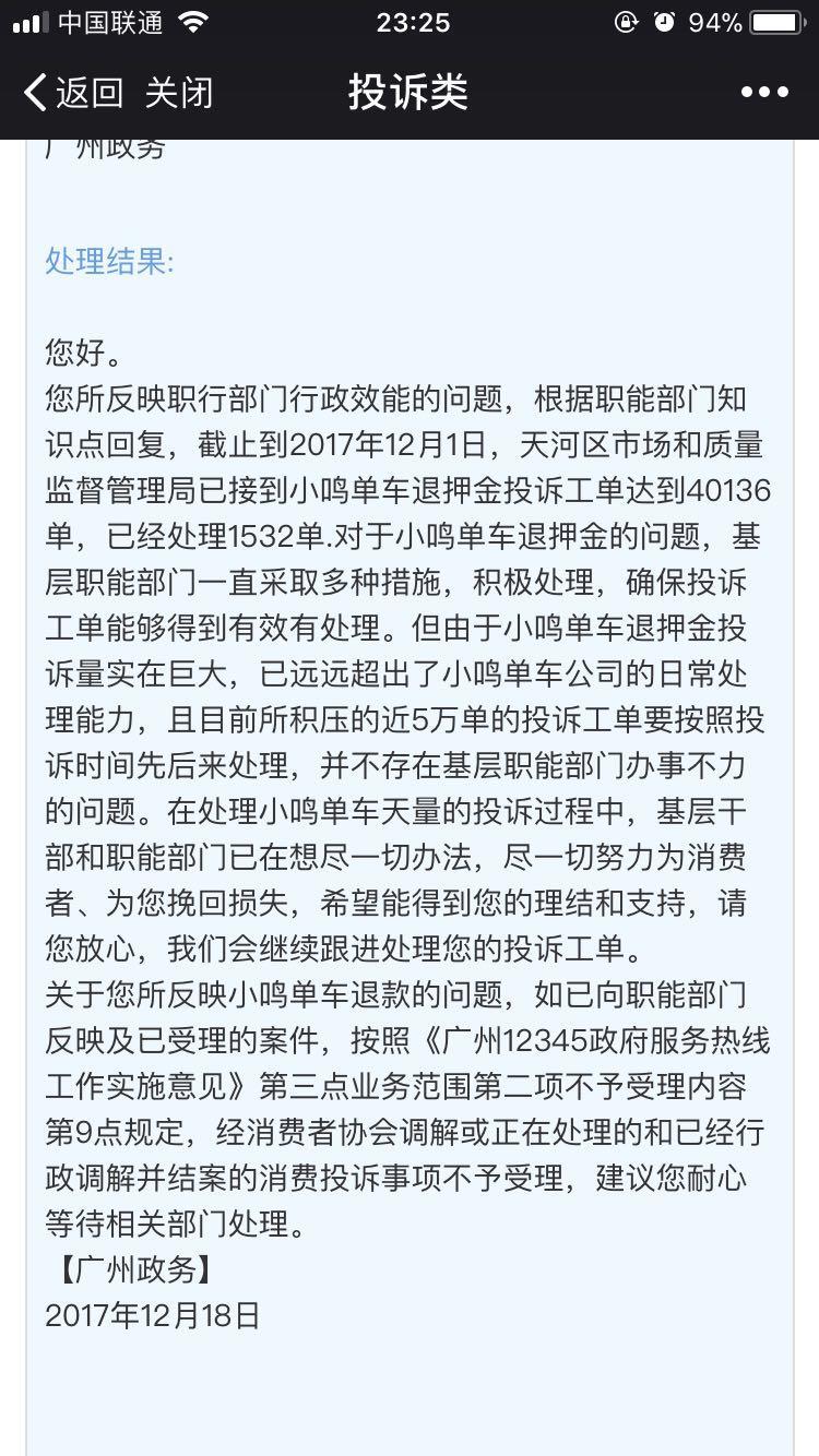 这个时候,广州消协已经受理了投诉,但是由于小鸣单车的投诉量较大,截止到2017年12月1日,天河区市场和监督管理局已接到小鸣单车退押金投诉工单达到40136单,已经处理1532单。对于小鸣单车退押金的问题,基层职能部门一直采取多种策略,积极处理,确保投诉工单能够得到有效处理。但由于小鸣单车退押金投诉量实在巨大,已远远超出了小鸣单车公司的日常处理能力,且目前所积压的5万单的投诉工单要按照投诉时间来先后处理。