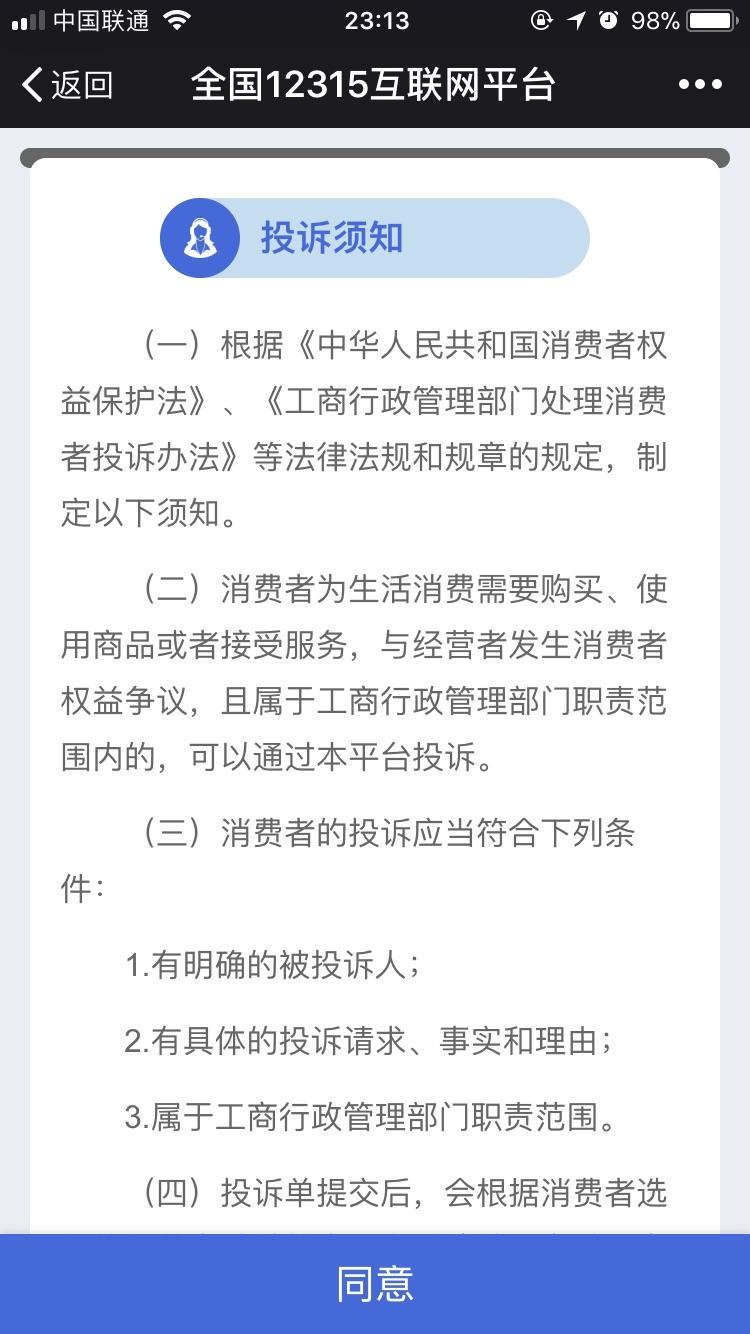在页面选项处,选择“我要投诉”, 可以看到投诉须知,在注册用户后 并点击“同意”。