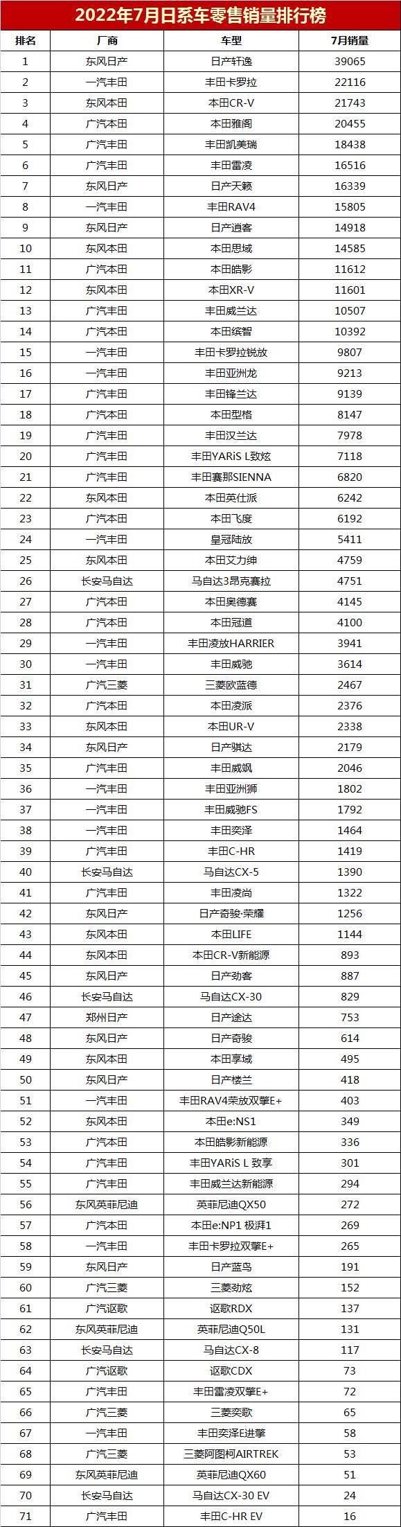 7月日系车销量排名,本田CR-V第三,天籁第七名,雅阁超凯美瑞