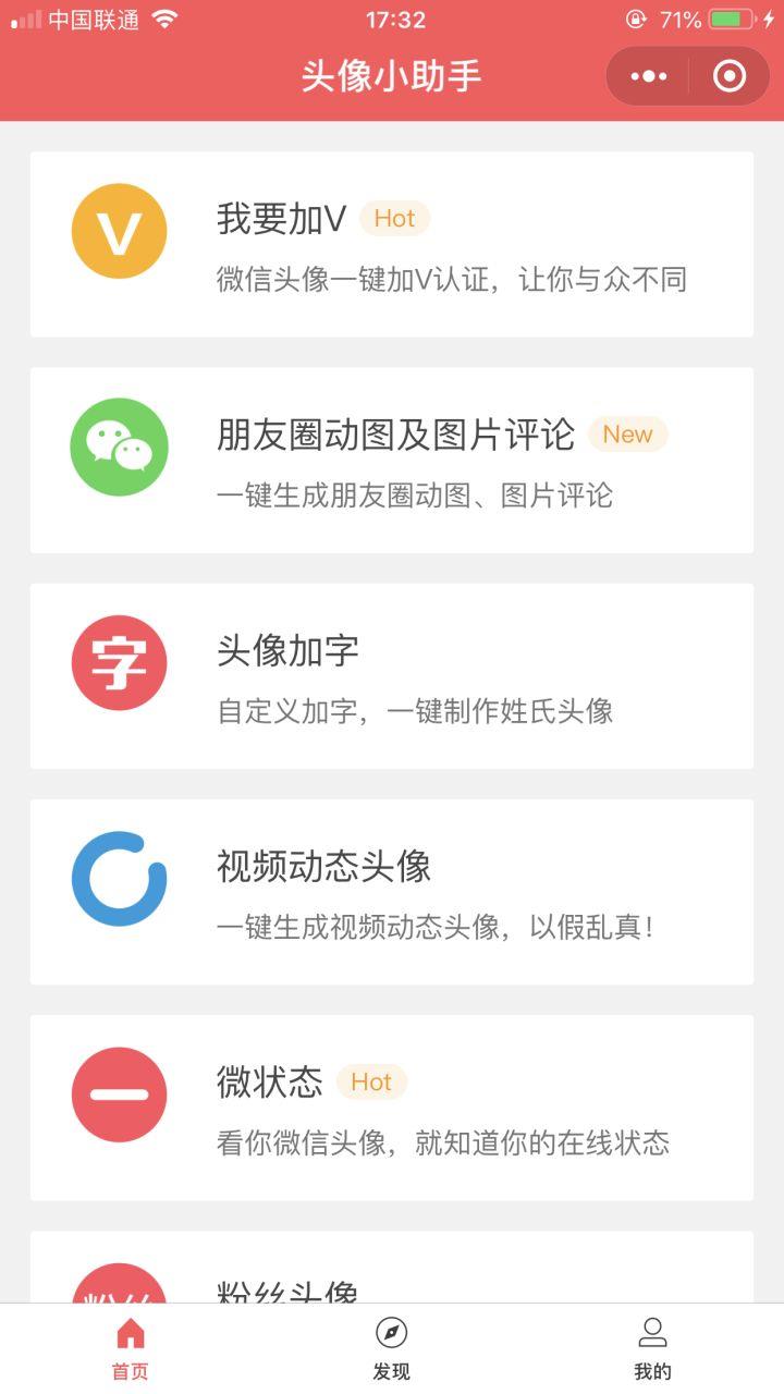 该小程序包含给微信头像加V、加字、加1、粉丝头像等功能,轻松制作个性微信头像。