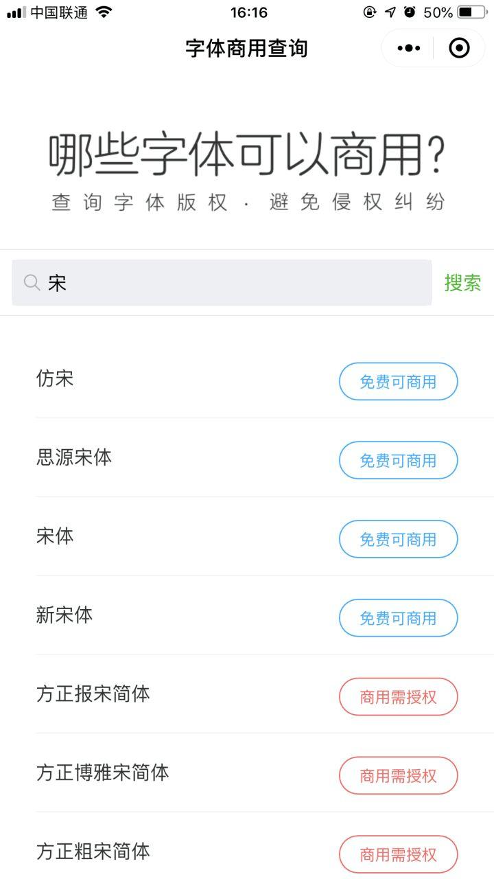 字体侵权案件越来越多,推荐这款【字体商用查询】小程序,在小程序里输入字体名称,查询一个字体是否可以商用,规避侵权风险。