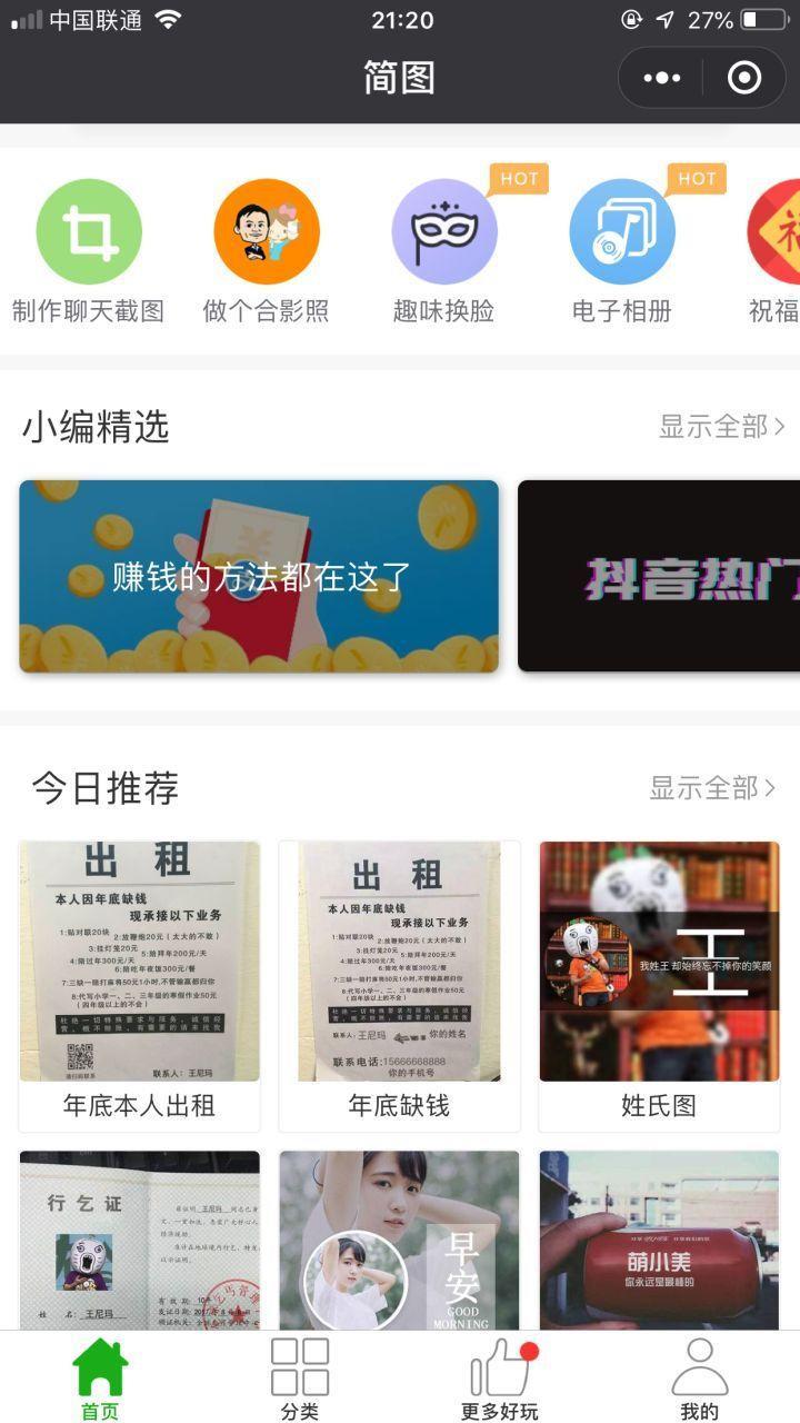 朋友圈集赞生成图、微信聊天记录、转账记录、明星合影、恶搞装*截图等都可以用这个小程序制作。