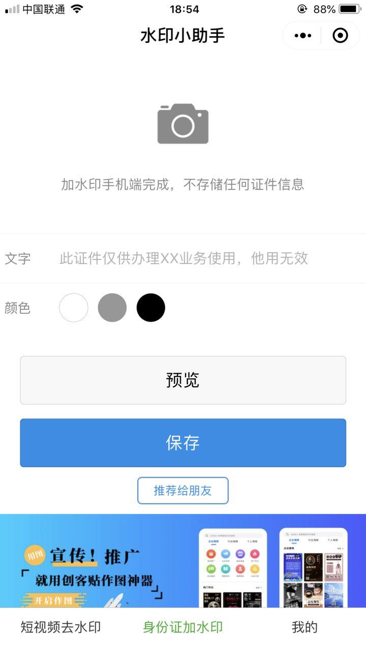 一键给身份证、营业执照等重要信息打水印,防止信息被滥用,操作简单,使用不会太频繁,用小程序正好。