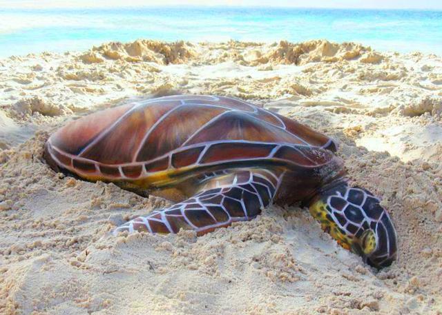 再看这只巨大的海龟,正一动不动地趴在沙滩上,距离稍远的话,的确很难发现,这只巨大的海龟居然是画在一个男人的身体上!他的下半身埋在沙子里,上半身趴在沙滩上,将一半脑袋埋进沙子里,作出海龟趴着的姿态。