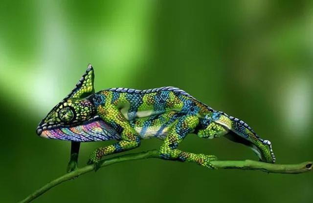 再看这只趴在树枝上的变色龙,由两名模特摆出变色龙的样子,形成几乎和变色龙身体形态完全一致的造型,再加上精致细腻的细节描绘,简直以假乱真!让人觉得眼前这只变色龙的确是太逼真了,绝对称得上栩栩如生!
