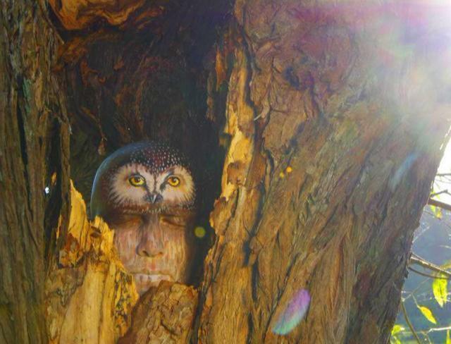 这只树洞里的猫头鹰,看起来也比较逼真,如果不是人物头部的鼻子和嘴比较突出,从远处看也很难发现,这只猫头鹰居然是在人脸上画出来的,不仅如此,猫头鹰的整体造型、色彩,也和这棵大树完美地融为一体。