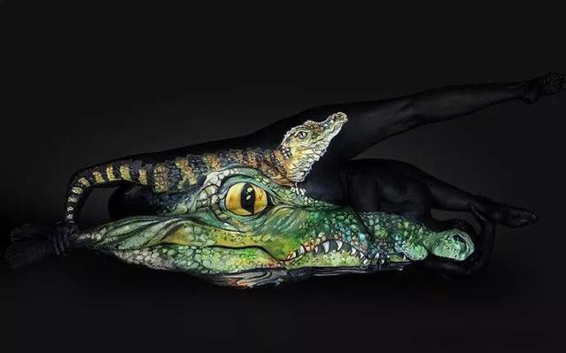 这个画面中画了一大一小两只鳄鱼,大鳄鱼静静地浮在水面上,露出了自己的脑袋,小鳄鱼也静静地趴在大鳄鱼的背上,画面看起来非常逼真,如果不仔细看,第一眼根本没认出来,原来这两只鳄鱼完全是画在人体上的,你看出来了吗?