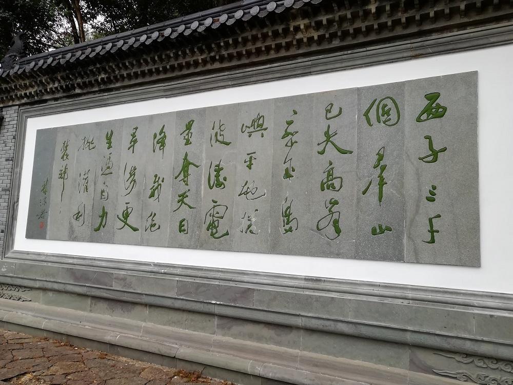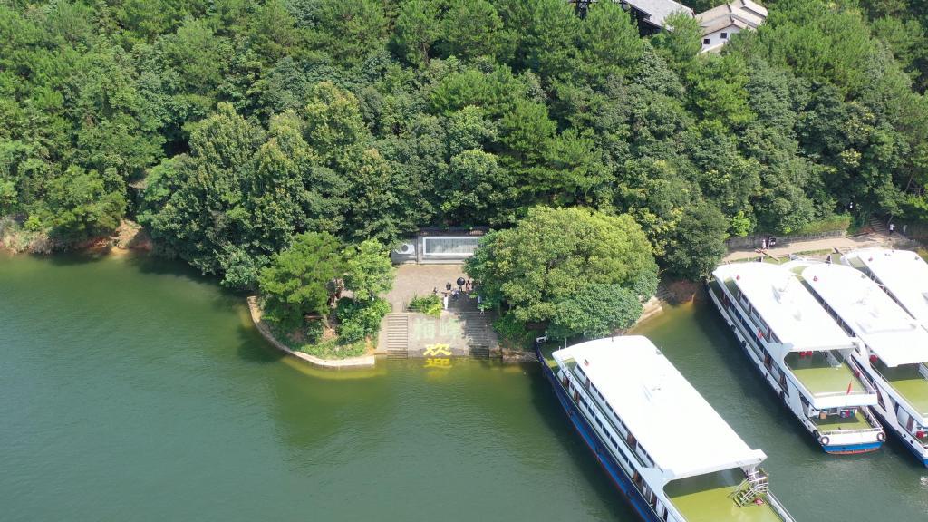 踏上梅峰码头,首先映入眼帘的是一块照壁,照壁的底料是用千岛湖的茶园石片拼凑而成。上刻郭沫若先生参观新安江水电站,畅游新安江水库时留下的著名诗句:“西子三千个,群山已失高。峰峦成岛屿,平地卷波涛。电量夺天日,洚威绝旱涝。更生凭自力,排灌利农郊。”诗的前四句写出了新安江水电站的形成,后四句写的是当时新安江水库在发电、控制洪涝灾害、农业灌溉等方面的作用。
