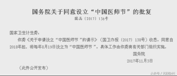 国务院日前批复,同意自2018年起,将每年8月19日设立为"中国医师节"。此前,医生群体也有属于行业内部的节日。2011年6月26日,中国医师协会正式公布《中国医师宣言*,将每年6月26日定为医师协会医师节,但是这个节日是由民间组织自发设立的,没有得到官方认定,几年来一直局限于医生群体内部,很少被人知晓。国务院此次批复同意设立"中国医师节",医生们也是打心眼儿里高兴。