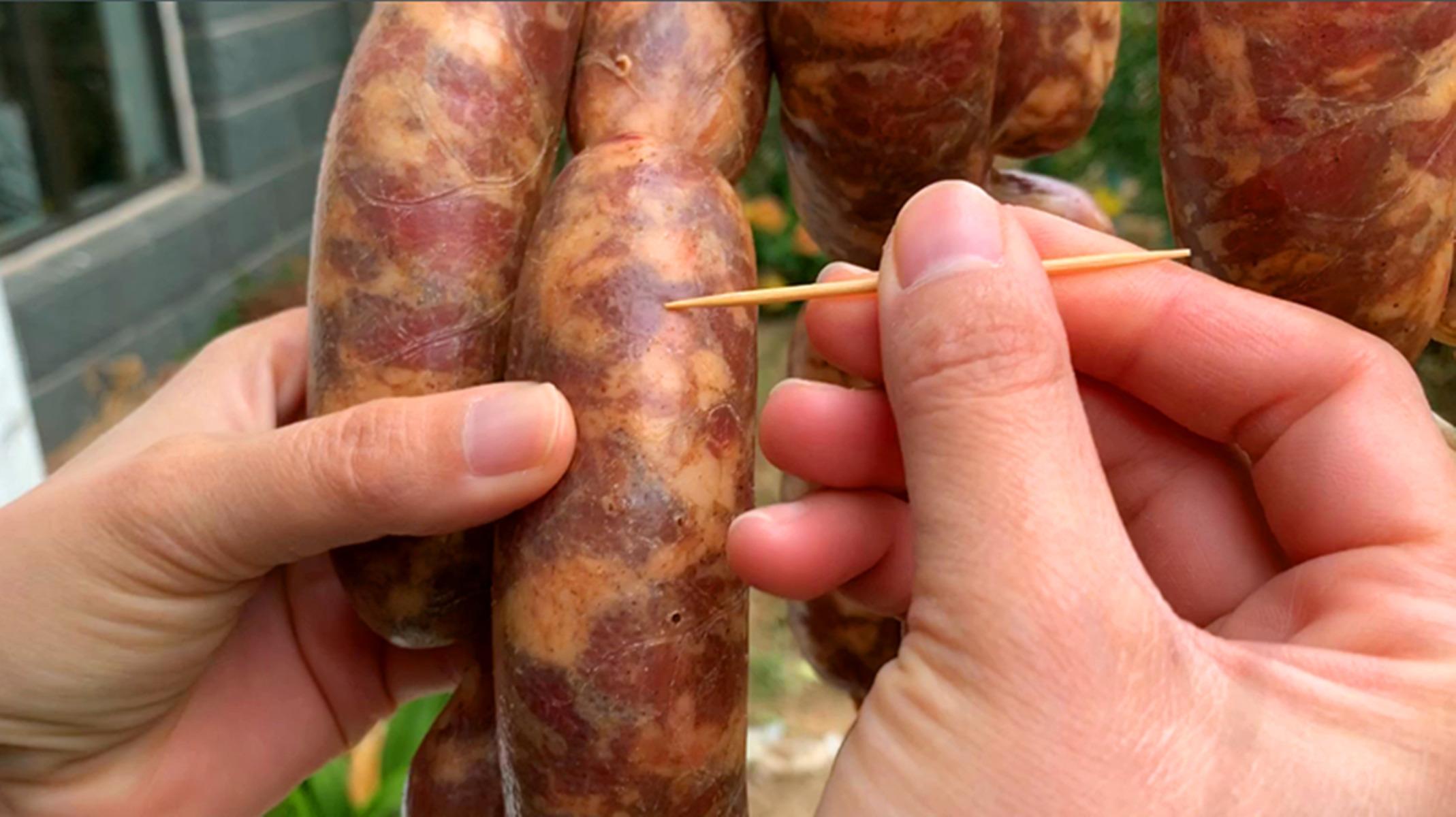 灌好的香肠,直接晒是大忌!多加1步,腊肉没有腥味,香味更足,灌好香肠后,把腊肠放在阴凉通风处自然晾干,窍门2:看到肠衣有空气的地方,用牙签扎个眼,把空气挤出来,这样晒干后就会很结实,切的时候就不会散开啦,这一步一定要注意哦,很重要。