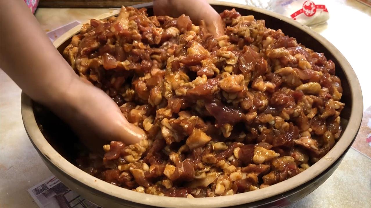 灌香肠时,记住“1腌2窍门”,腊肉没腥味,紧实不炸裂,太香了,具体配料:10斤肉:盐45克,味精30克,白糖150克,酱油350克,白酒150克,十三香一包,45克,抓匀后腌制20分钟入味,然后就可以开始灌肠了,