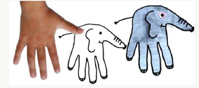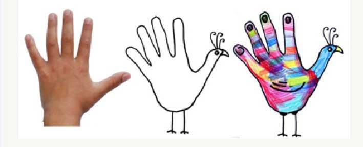 什么是手掌印画呢?其实很简单,就是学习用手掌蘸颜料均衡用力的方式印画。通过改变手型的方向,印出想象中的图案,并进行简单的添画。