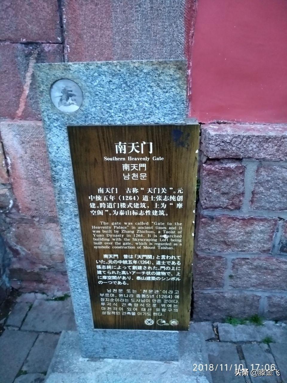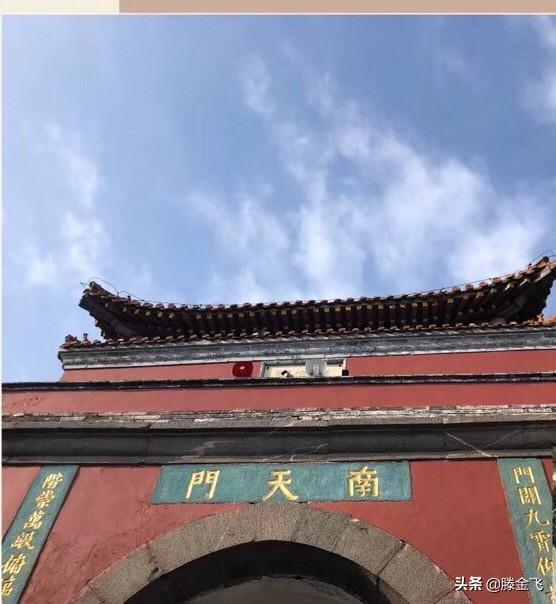 南天门是十八盘登山步道的尽头,与上山索道汇合于一处。站在南天门前,前方可见陡峭笔直的徒步登山的石阶,右边则通往索道南天门站。南天门是泰山旅行的重要一站,南天门后便没有非常难走的山道了。 南天门是一个两层结构的紫红色的城门,下面是拱形的山门,上面是城楼。