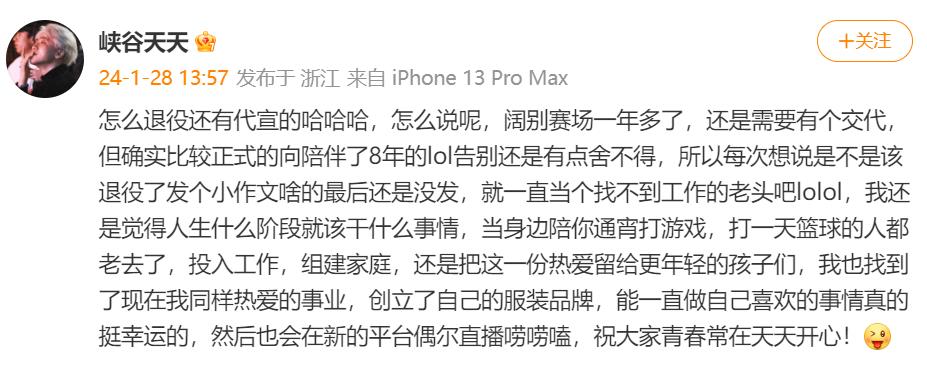 他认为,人生什么阶段就该干什么事情。“当身边陪你通宵打游戏,打一天篮球的人都组建家庭了,还是把热爱给更年轻的孩子们吧。我也找到了热爱的事业,创立了自己的服装品牌,能一直做喜欢的事情真的挺幸运,之后也会在新的平台偶尔直播唠唠嗑。”