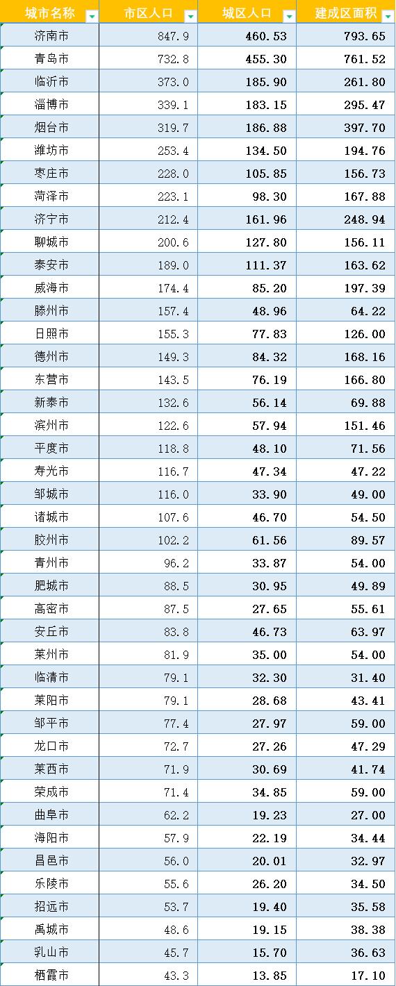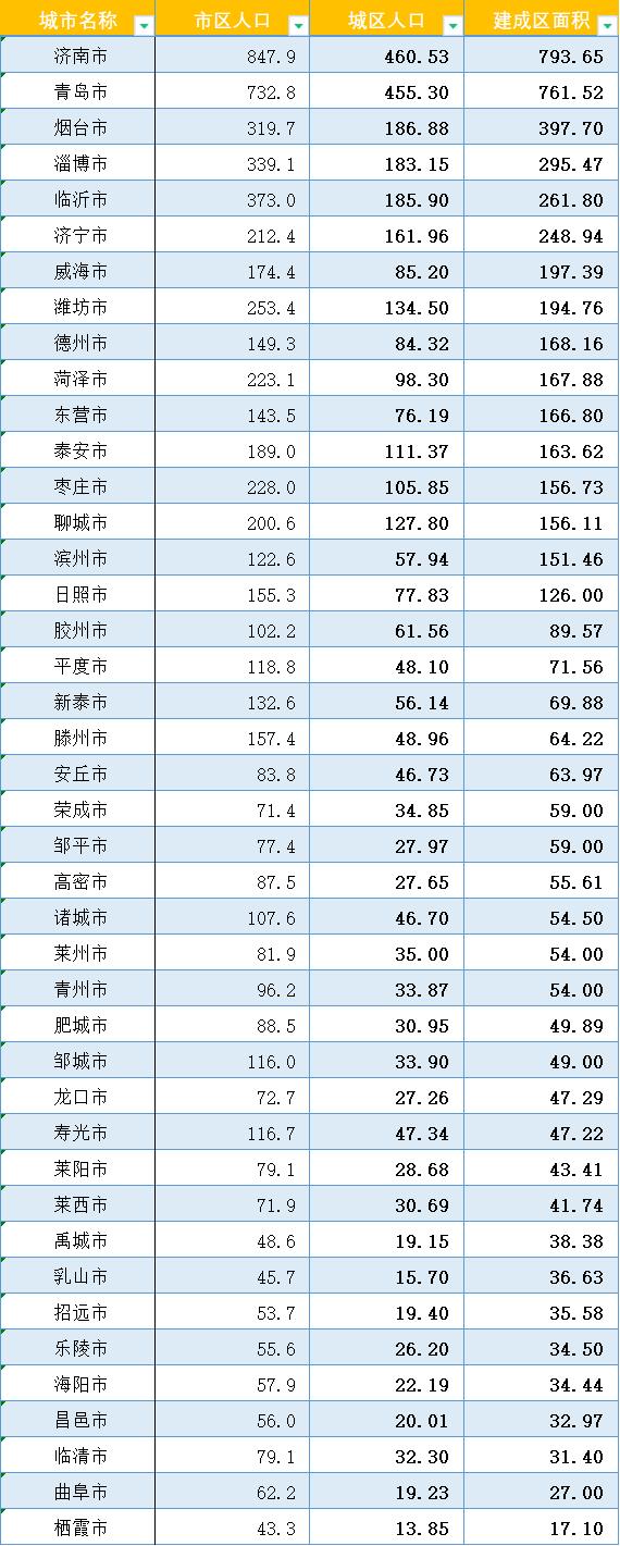 山东省各市市区人口、城区人口、建成区面积等信息