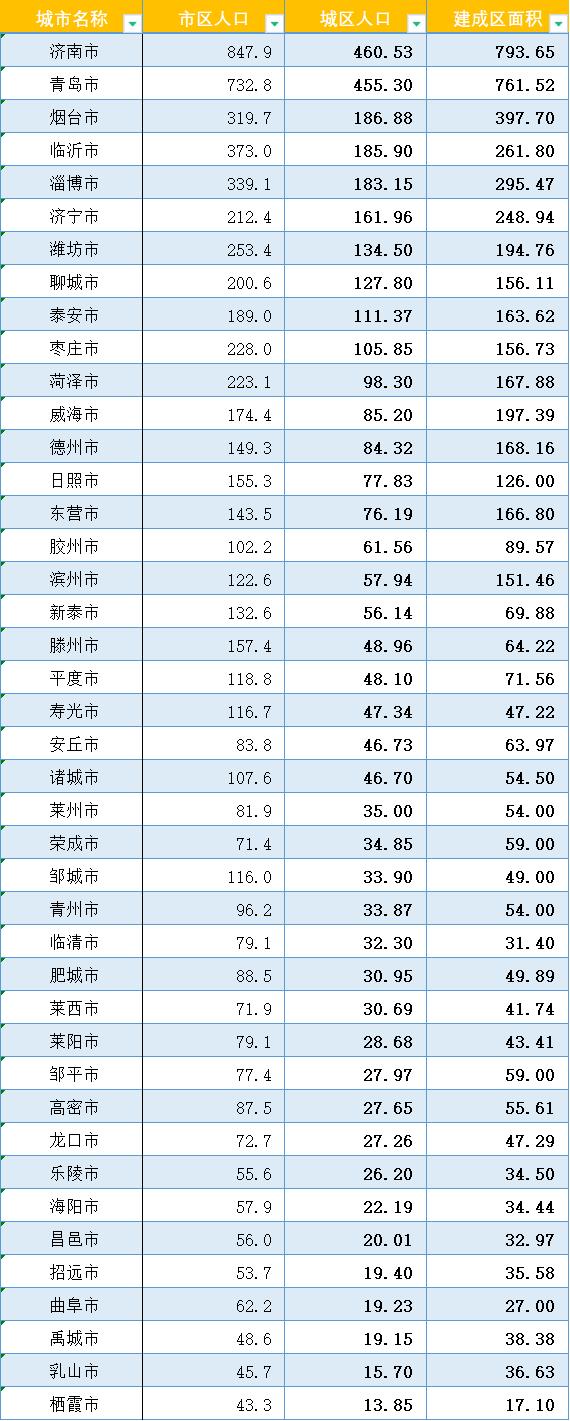 山东省各市的市区人口、城区人口以及城市建成区排名