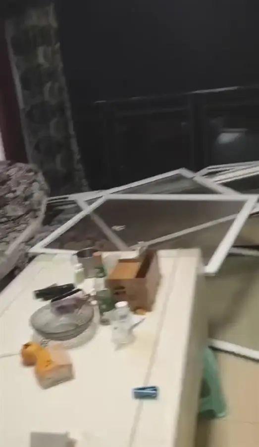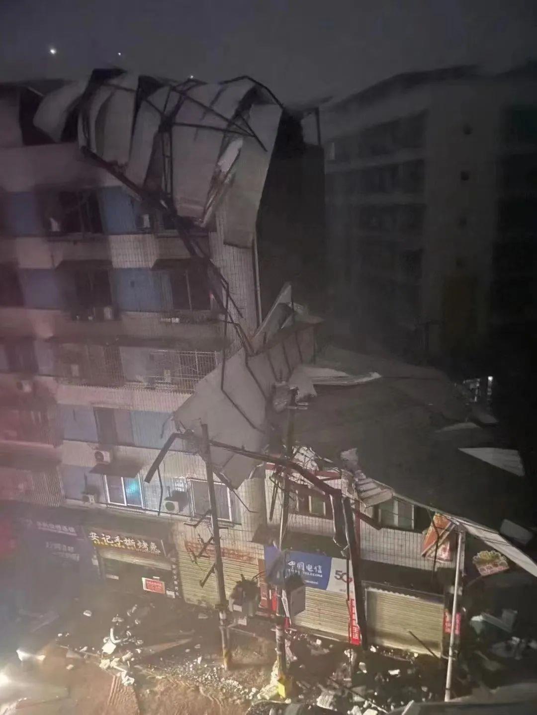 有的居民楼楼顶搭建的铁皮棚被吹掉落到楼下
