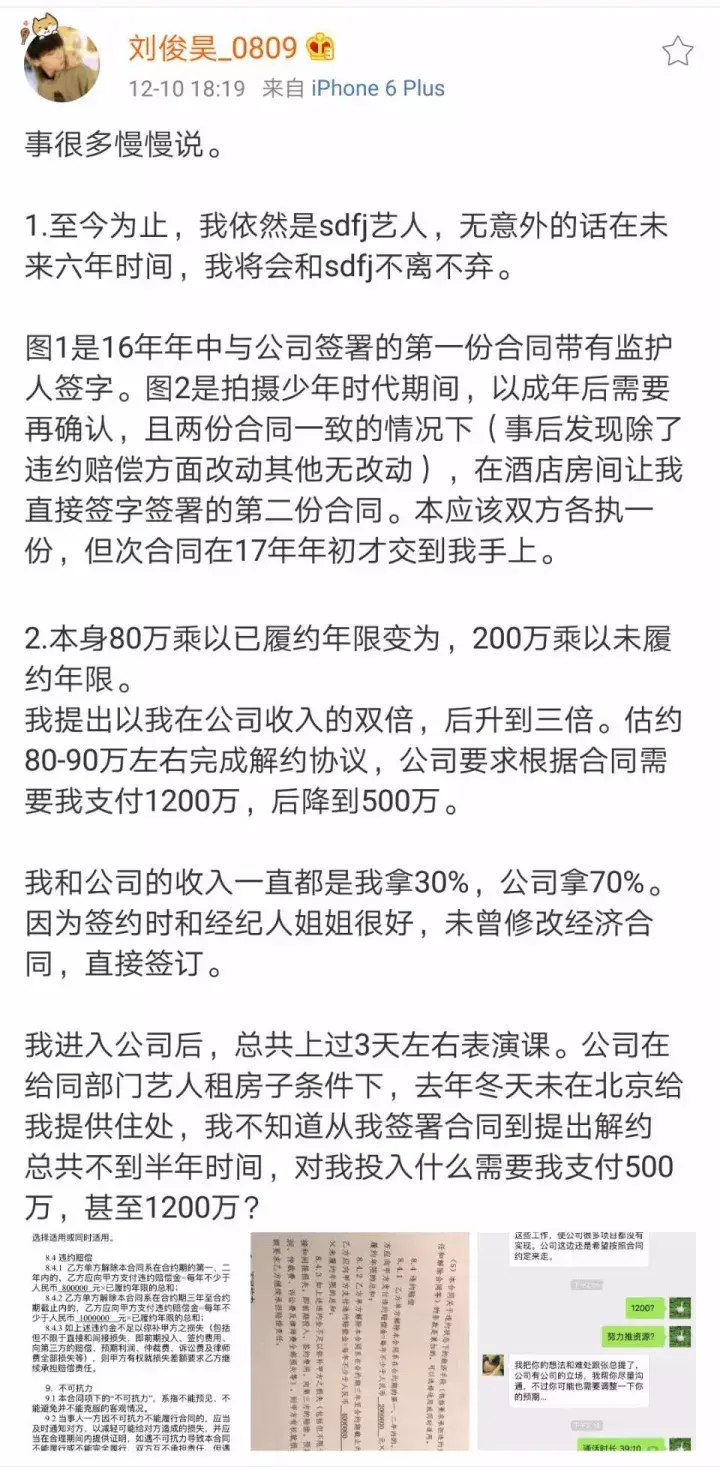 在发完第一条微博后,刘俊昊再次发了一条更为详细的微博,控诉一系列不平等待遇,还曝光和公司签的合约以及和工作人员的聊天记录。