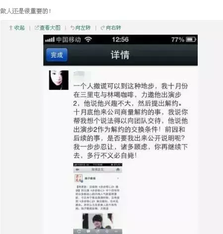 对于这个新闻,微博认证为湖南卫视资深娱乐导演的网友在微博晒出一张疑似蔡艺侬的微信朋友圈截图,文中称“十月份就力邀他演《步步2》,他说兴趣不大,然后提出解约。”