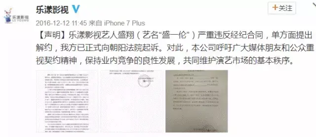 乐漾影视发微博单方面和盛一伦提出解约,因为盛一伦严重违反了经纪合同。