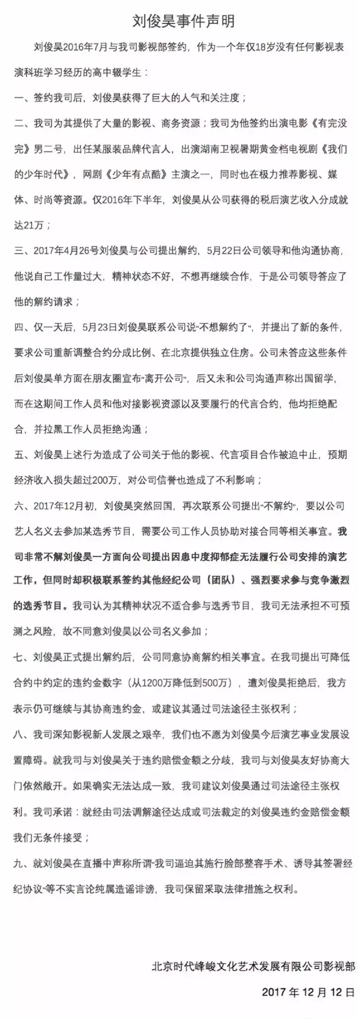 声明指出刘俊昊18岁新人进入公司税后21万,帮他接了很多资源,不料刘俊昊却提出解约,公司多次协调未果,还否认了公司逼迫他微调和整容的传闻。