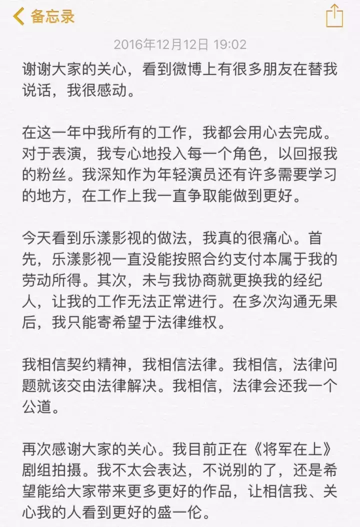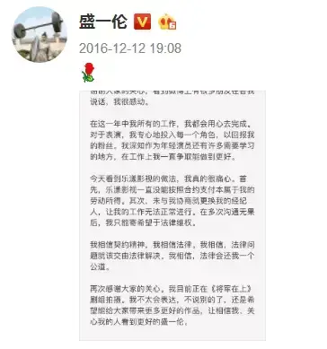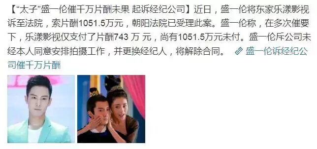 但是,乐漾拖欠了盛一伦的片酬,而且没有和盛一伦协商就随意更换经纪人,让工作无法正常进行,多次沟通无果后,只能寄希望于法律维权。
