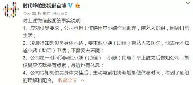 凌晨的时候,再发了一条微信截图的文字总结,可以看出,刘俊昊的助理是他自己的小姨,公司也承担了小姨的工资,而且公司对于刘俊昊照顾有加,很爱护刘俊昊的身体,并没有压榨刘俊昊。