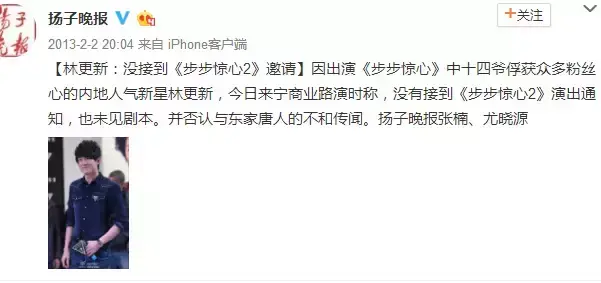 《步步惊心2》准备开拍时,林更新称没有接到《步步惊心2》演出通知,也未见剧本。