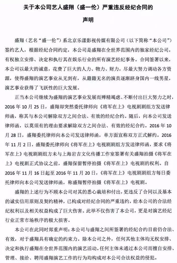 至于盛一伦是怎么违反经纪合同的呢?声明中指出,公司为盛一伦事业发展殚精竭虑时,盛一伦突然委托律师向《将军在上》电视剧剧组方发送律师函以莫须有的理由与公司解约,当然这莫须有的理由声明中没说。