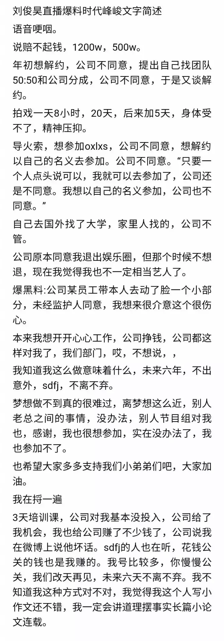 微博和直播内容总结一下就是公司对于刘俊昊不投资不培养,从进公司到今天只上了三天表演课,不提供住宿,助理费用自己出,自己报名参加节目不允许,不经过监护人同意就带未成年的他去整容还是自费,耗费青春不给解约,解约费要1200W或者500W,不解约就这样耗六年。