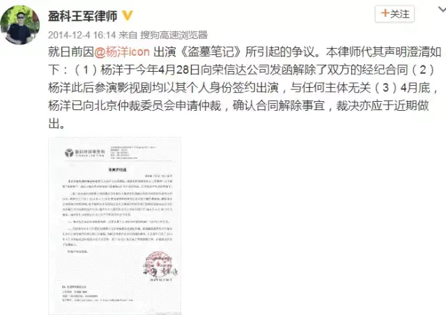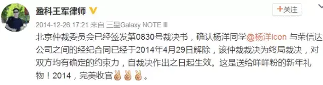 20多天后,该律师再次发布微博,表示北京仲裁委员会签发了裁决,杨洋与荣信达经纪合同已解除。