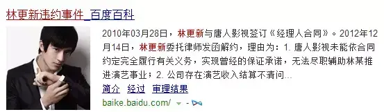 林更新在和唐人解约后,演艺事业也是发展地风生水起,更夸张的是,百度百科居然还有“林更新违约事件”的词条,看来这件事当年也是闹得不小。