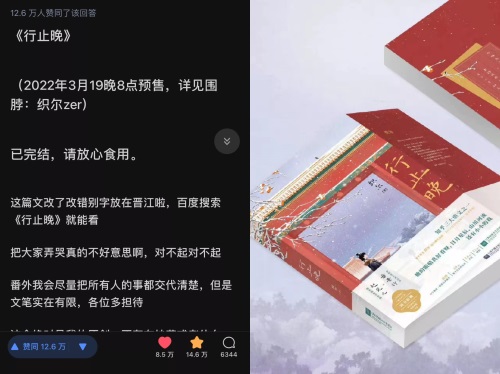 两个月后的某一天,织尔发现自己写下的回答上了推荐位和精选。持续被推荐了约半年,《行止晚》被越来越多人看见。