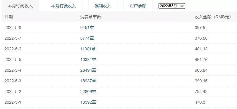 罐头的收入也跟着涨,开文一个月就获得了单篇8000元收入,在新书期(开篇2个月内)有一万多收藏。