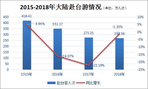 2008年,陆客赴台人次有32万,2009年便一下跃升至97万,逼近多年来一直占据台湾境外游客最大来源国日本的数据(100万人次)。2010年,陆客以163万人次轻松赶超日本。2012年,陆客人次已是日本的1.8倍。从2011年至2015年,大陆赴台游客不断增长(178.4万、258.6万、287.4万、398.7万、418.4万)。